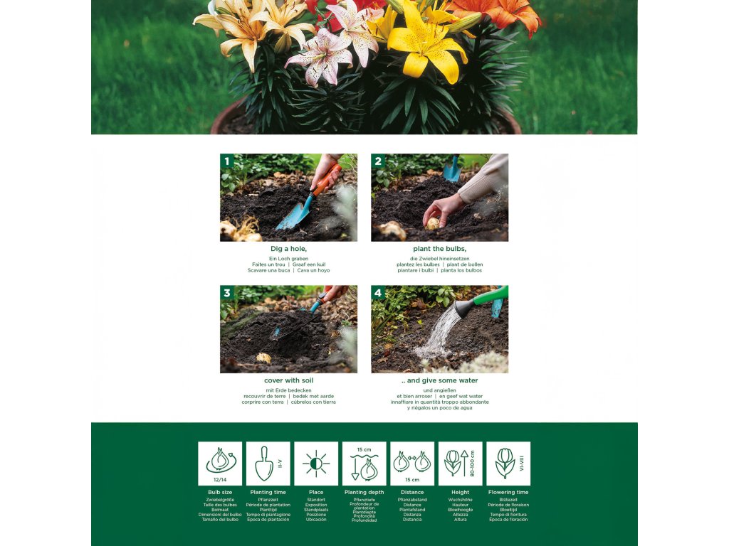 Při výsadbě dodržujeme vzdálenost mezi cibulkami. Rozestup výsadby je trojnásobek šířky cibule. Pro hloubku výsadby dodržujeme trojnásobek výšky cibule. Umístěte cibulky na slunce a ihned po zasazení dobře zalijte.