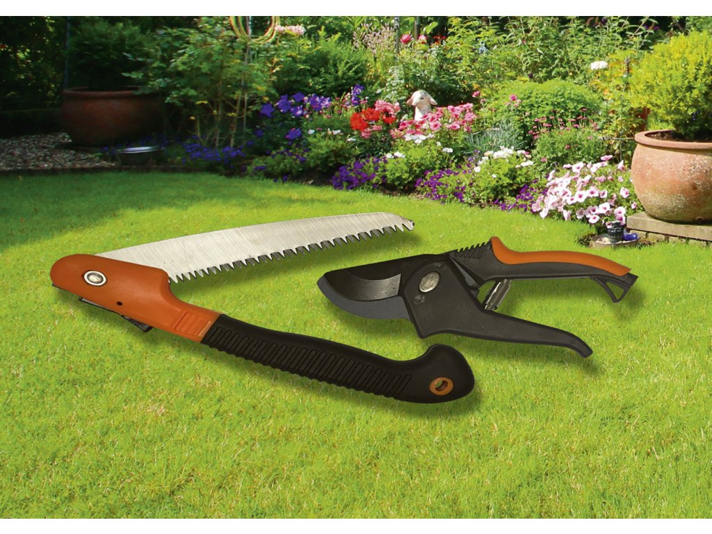 Praktické duo, které se hodí každému hobby zahrádkáři při drobných úpravách stromků, keřů a rostlin. Profesionální zahradní nůžky pro úpravu zahrady a skládací pilka .